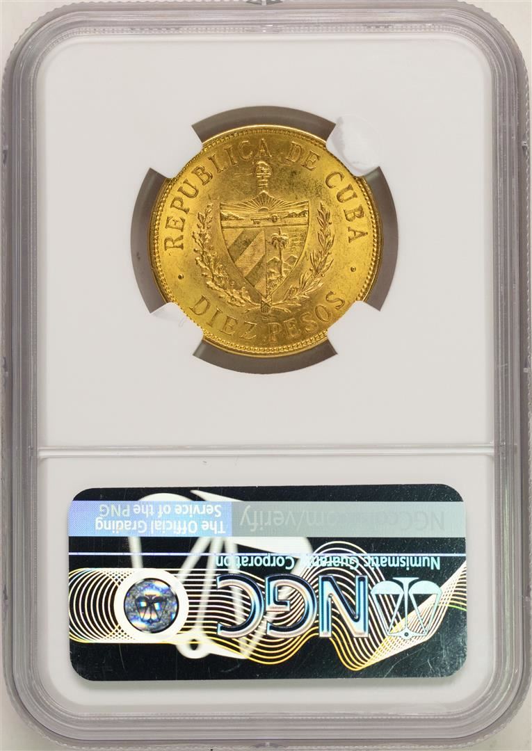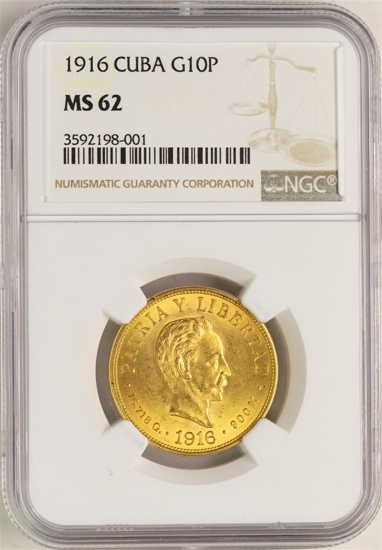 One 1916 Cuba 10 Pesos Gold Coin NGC MS62. NGC Certified.