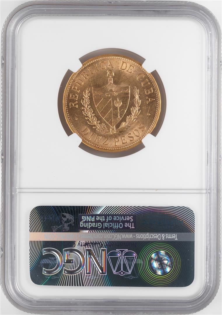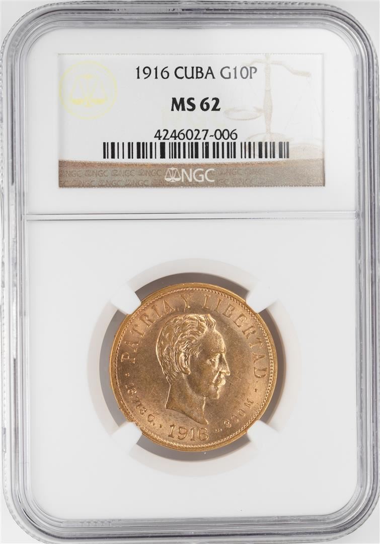 One 1916 Cuba 10 Pesos Gold Coin NGC MS62. NGC Certified.