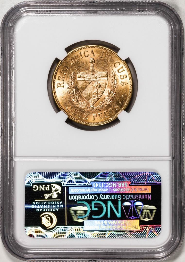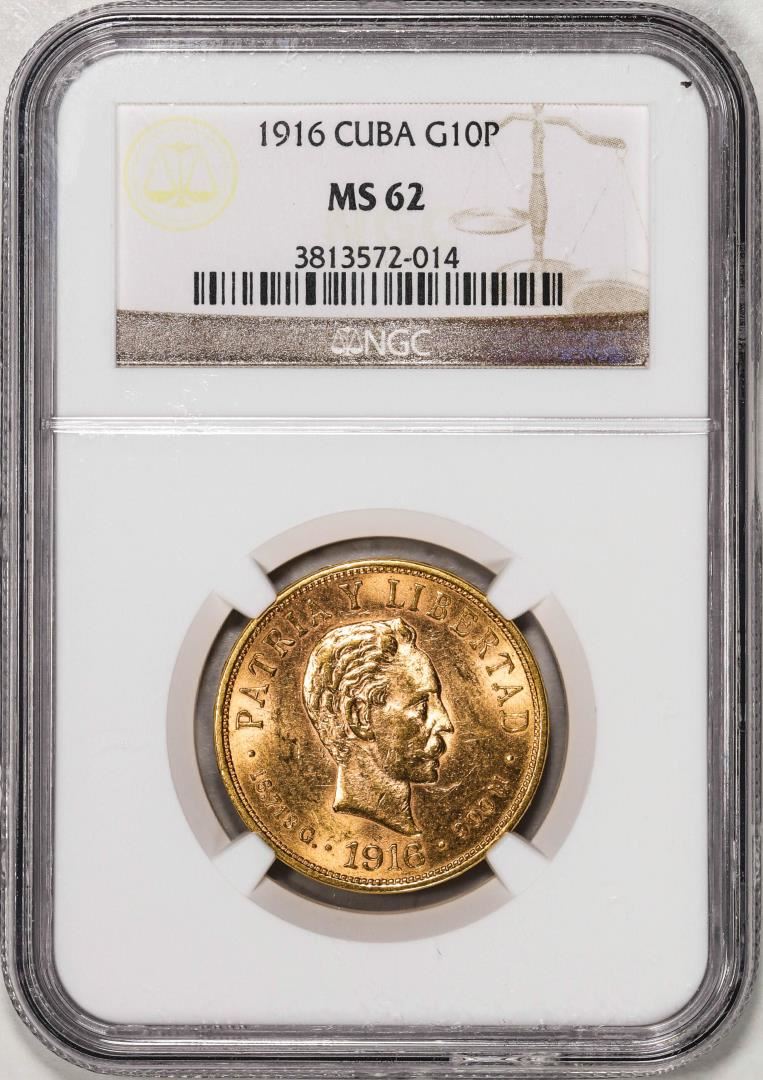 One 1916 Cuba 10 Pesos Gold Coin NGC MS62. NGC Certified.