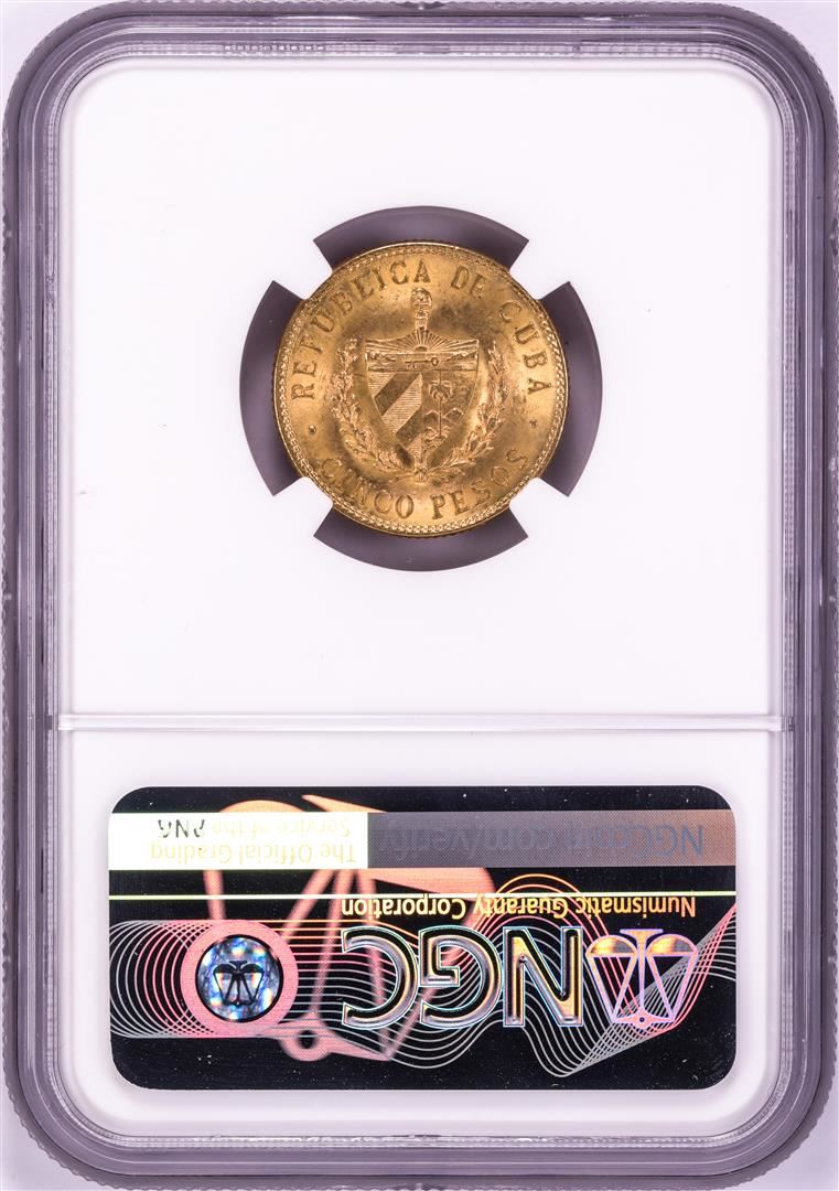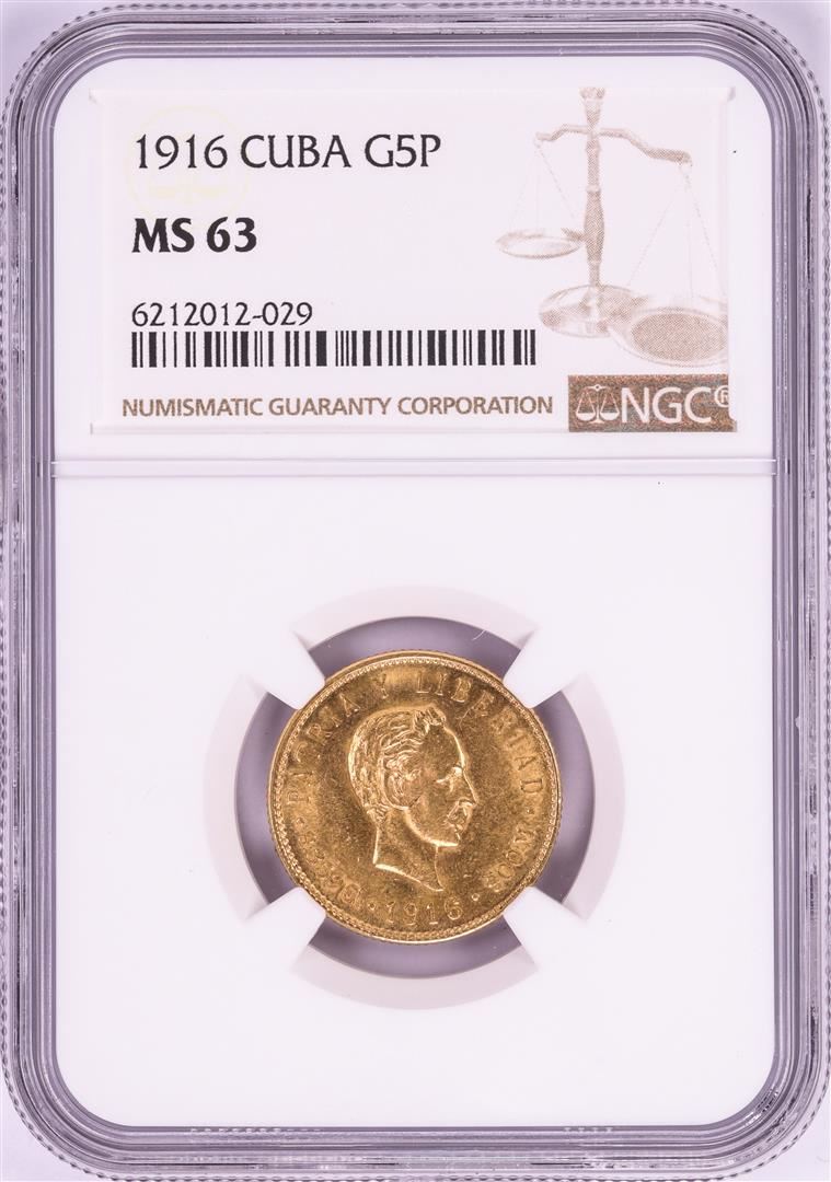 One 1916 Cuba 5 Pesos Gold Coin NGC MS63. NGC Certified.