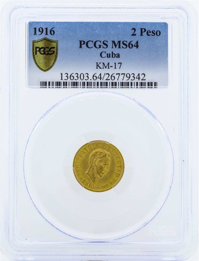 One 1916 Cuba Dos Pesos Gold Coin PCGS MS64. PCGS Graded.