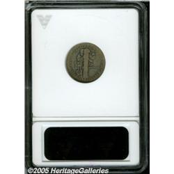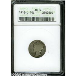 <B>1916-D 10C AG3 ANACS.</B></I> Natural silvery-gray color with pale heather on the reverse, typical of the appearance of silver coins that were housed in the inexpensive coin folders popular not so many years ago. This example has no problems other than a bit too much wear. The border is merged with the very tops of the letters on both sides, but the important date and mintmark elements are fully visible.