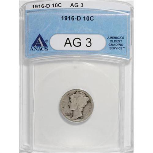 <B>1916-D 10C AG3 ANACS.</B></I> NGC Census: (469/714). PCGS Population (797/1926). Mintage: 264,000. Numismedia Wsl. Price for NGC/PCGS coin in AG3 : $488. (#4906)<BR><BR><B>Coin Engraver:</B> Adolph A. Weinman<BR><BR><b>Shipping:</b> Coins & Currency (<a target="_blank" href="http://www.heritageauctions.com/common/shipping.php">view shipping information</a>\)