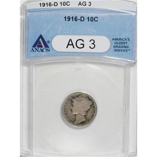 <B>1916-D 10C AG3 ANACS.</B></I> NGC Census: (475/728). PCGS Population (844/2001). Mintage: 264,000. Numismedia Wsl. Price for NGC/PCGS coin in AG3 : $488. (#4906)<BR><BR><B>Coin Engraver:</B> Adolph A. Weinman<BR><BR><b>Shipping:</b> Coins & Currency (<a target="_blank" href="http://www.heritageauctions.com/common/shipping.php">view shipping information</a>\)