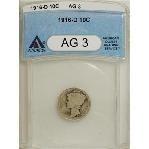 <B>1916-D 10C AG3 ANACS.</B></I> NGC Census: (475/728). PCGS Population (844/2001). Mintage: 264,000. Numismedia Wsl. Price for NGC/PCGS coin in AG3 : $488. (#4906)<BR><BR><B>Coin Engraver:</B> Adolph A. Weinman<BR><BR><b>Shipping:</b> Coins & Currency (<a target="_blank" href="http://www.heritageauctions.com/common/shipping.php">view shipping information</a>\)