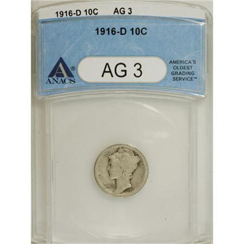 <B>1916-D 10C AG3 ANACS.</B></I> NGC Census: (477/727). PCGS Population (848/2012). Mintage: 264,000. Numismedia Wsl. Price for NGC/PCGS coin in AG3 : $488. (#4906)<BR><BR><B>Coin Engraver:</B> Adolph A. Weinman<BR><BR><b>Shipping:</b> Coins & Currency (<a target="_blank" href="http://www.heritageauctions.com/common/shipping.php">view shipping information</a>)