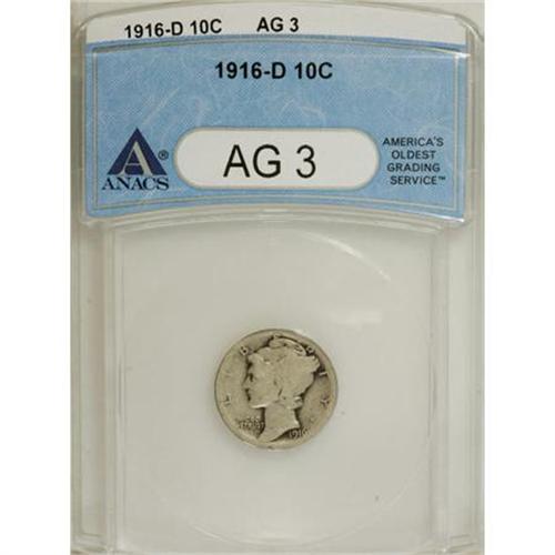 <B>1916-D 10C AG3 ANACS.</B></I> NGC Census: (477/727). PCGS Population (848/2012). Mintage: 264,000. Numismedia Wsl. Price for NGC/PCGS coin in AG3 : $488. (#4906)<BR><BR><B>Coin Engraver:</B> Adolph A. Weinman<BR><BR><b>Shipping:</b> Coins & Currency (<a target="_blank" href="http://www.heritageauctions.com/common/shipping.php">view shipping information</a>)