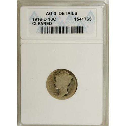 <B>1916-D 10C --Cleaned--ANACS. AG3 Details.</B></I> NGC Census: (480/733). PCGS Population (848/2015). Mintage: 264,000. Numismedia Wsl. Price for NGC/PCGS coin in AG3 : $488. (#4906)<BR><BR><B>Coin Engraver:</B> Adolph A. Weinman<BR><BR><b>Shipping:</b> Coins & Currency (<a target="_blank" href="http://www.heritageauctions.com/common/shipping.php">view shipping information</a>)