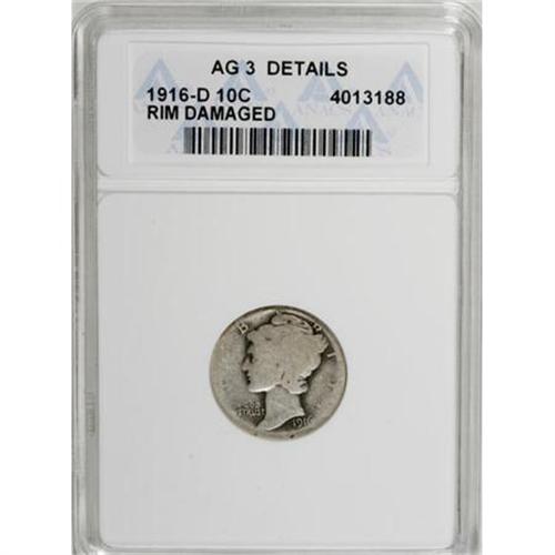 <B>1916-D 10C --Rim Damaged--ANACS. AG3 Details.</B></I> NGC Census: (485/733). PCGS Population (880/2056). Mintage: 264,000. Numismedia Wsl. Price for NGC/PCGS coin in AG3 : $488. (#4906)<BR><BR><B>Coin Engraver:</B> Adolph A. Weinman<BR><BR><b>Shipping:</b> Coins & Currency (<a target="_blank" href="http://www.heritageauctions.com/common/shipping.php">view shipping information</a>)