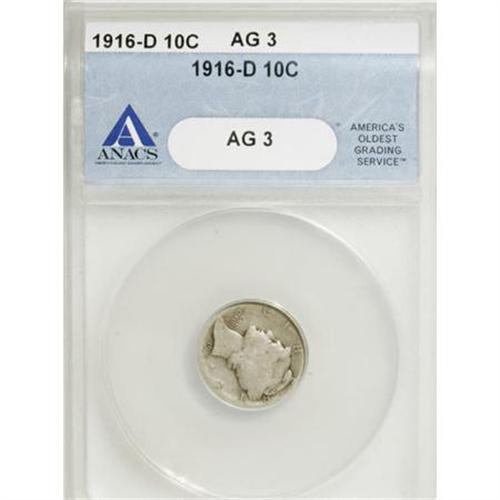 <B>1916-D 10C AG3 ANACS.</B></I> Though both sides exhibit heavy wear, the all-important date and mintmark remain bold on this AG3 representative. Silver-gray surfaces show occasional small streaks of slightly deeper toning and a few tiny marks on Liberty's neck.<BR><BR><B>Coin Engraver:</B> Adolph A. Weinman<BR><BR><b>Shipping:</b> Coins & Currency (<a target="_blank" href="http://www.heritageauctions.com/common/shipping.php">view shipping information</a>)