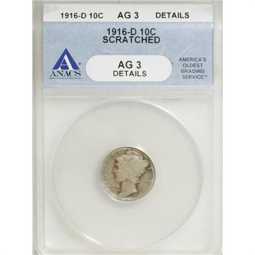 <B>1916-D 10C --Scratched--ANACS. AG3 Details.</B></I> The date, mintmark, and LIBERTY are bold. The tops of UNITED STATES OF AMERICA are worn into the rim, and a couple of thin marks are present east of the obverse motto. The reverse has minor dings at 5 and 11 o'clock. A collectible example of this coveted series key.<BR><BR><B>Coin Engraver:</B> Adolph A. Weinman<BR><BR><b>Shipping:</b> Coins & Currency (<a target="_blank" href="http://www.heritageauctions.com/common/shipping.php">view shipping information</a>)