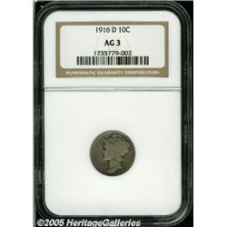 <B>1916-D 10C AG3 NGC.</B></I> This original dove-gray key date Dime is attractive for the grade, since the date and mintmark are clear and the legends are mostly intact. A mark on the L in LIBERTY is barely deserving of mention.