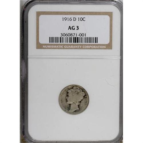 <B>1916-D 10C AG3 NGC.</B></I> NGC Census: (485/733). PCGS Population (858/2030). Mintage: 264,000. Numismedia Wsl. Price for NGC/PCGS coin in AG3 : $488. (#4906)<BR><BR><B>Coin Engraver:</B> Adolph A. Weinman<BR><BR><b>Shipping:</b> Coins & Currency (<a target="_blank" href="http://www.heritageauctions.com/common/shipping.php">view shipping information</a>)