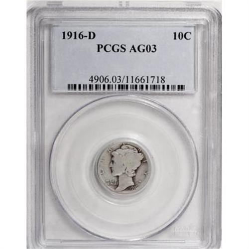 <B>1916-D 10C AG3 PCGS.</B></I> Though heavily worn, this cloud-gray and charcoal-toned key is fundamentally appealing. An abrasion that affects the L of LIBERTY is the only readily perceptible flaw.<BR><BR><B>Coin Engraver:</B> Adolph A. Weinman<BR><BR><b>Shipping:</b> Coins & Currency (<a target="_blank" href="http://www.heritageauctions.com/common/shipping.php">view shipping information</a>)