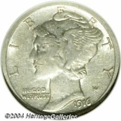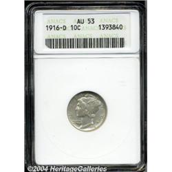 <B>1916-D<10C> AU53 ANACS.</B></I> Silver-gray surfaces reveal subtle olive and gold accents over generous portions of mint luster. Plenty of sharp strike definition also exists, an exception being flatness in Mercury's hair and lower left wing. A moderate abrasion occurs on Liberty's cheek, and a less noticeable mark is to be found on the upper part of the fasces. An AU example of one of the most coveted of all 20th century silver issues, and the undisputed key to the Mercury Dime series.<BR><I>From The Paulsboro Collection, Part Two.</B></I> <BR><BR><B>Important notice:</B> Heritage usually auctions material at the rate of 200-250 lots per hour. On some occasions eBay Live bid software or the Internet may not be able to keep up with the pace of the auction. We recommend placing a realistic absentee bid now as insurance to avoid disappointment. Occasionally the auctioneer may eliminate or reject an eBay Live bid, and the auctioneer may also reopen a lot after the close of the eBay live bidding (usually because we missed an audience bid), and may reject your bid even if it shows you as the winning bidder. By bidding via eBay Live, you agree that Heritage may award the lot to another bidder at its sole discretion under the circumstances described above or any other reasonable circumstances. Since eBay bids are not shown to us until we open the lot on the floor, we treat those bids just like floor bids. In most cases the floor responds before the eBay bid is presented to us, due to Internet lag time, so for consistency we have made it a policy that floor bids are always considered first over tie eBay live bids. Also please note that all Heritage lots purchased through eBay Live carry a 20% Buyer's Premium. Please make sure you read the Terms and Conditions before you bid. </span></font></tr></table></td></tr></table>
