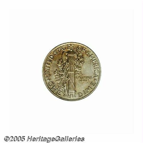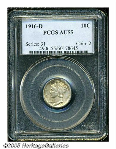 <B>1916-D<10C> AU55 PCGS.</B></I> Twentieth century key-date coins have been among the most popular and in demand items in numismatics over the past couple years. For the collector seeking a pleasing example of the rare 16-D Mercury Dime, this example will be a worthy candidate. The surfaces are light silver with hints of pale gold color and splashes of darker toning. It is sharply struck with full central bands on the reverse. A lovely example.