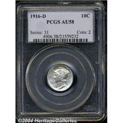 <B>1916-D<10C> AU58 PCGS.</B></I> This key date is bright and essentially untoned. The design elements are nicely detailed, with minor softness on Mercury's hair and wings. Just a couple of inconspicuous small marks are apparent on the remarkably clean surfaces. Population: 45 in 58, 35 finer (7/04). <BR><BR><B>Important notice:</B> Heritage usually auctions material at the rate of 200-250 lots per hour. On some occasions eBay Live bid software or the Internet may not be able to keep up with the pace of the auction. We recommend placing a realistic absentee bid now as insurance to avoid disappointment. Occasionally the auctioneer may eliminate or reject an eBay Live bid, and the auctioneer may also reopen a lot after the close of the eBay live bidding (usually because we missed an audience bid), and may reject your bid even if it shows you as the winning bidder. By bidding via eBay Live, you agree that Heritage may award the lot to another bidder at its sole discretion under the circumstances described above or any other reasonable circumstances. Since eBay bids are not shown to us until we open the lot on the floor, we treat those bids just like floor bids. In most cases the floor responds before the eBay bid is presented to us, due to Internet lag time, so for consistency we have made it a policy that floor bids are always considered first over tie eBay live bids. Also please note that all Heritage lots purchased through eBay Live carry a 20% Buyer's Premium. Please make sure you read the Terms and Conditions before you bid. </span></font></tr></table></td></tr></table>