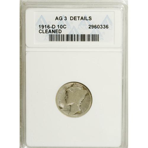 <B>1916-D 10C --Cleaned--ANACS. AG3 Details.</B></I> NGC Census: (0/1067). PCGS Population (801/1929). Mintage: 264,000. Numismedia Wsl. Price for NGC/PCGS coin in AG3 : $406. (#4906)<BR><BR><b>Shipping:</b> Coins & Currency (<a target="_blank" href="http://www.heritageauctions.com/common/shipping.php">view shipping information</a>)