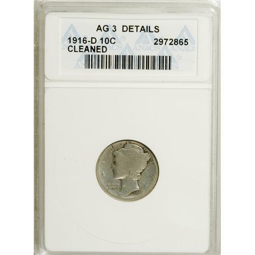 <B>1916-D 10C --Cleaned--ANACS. AG3 Details.</B></I> NGC Census: (458/1781). PCGS Population (801/1929). Mintage: 264,000. Numismedia Wsl. Price for NGC/PCGS coin in AG3 : $473. (#4906)<BR><BR><b>Shipping:</b> Coins & Currency (<a target="_blank" href="http://www.heritageauctions.com/common/shipping.php">view shipping information</a>)