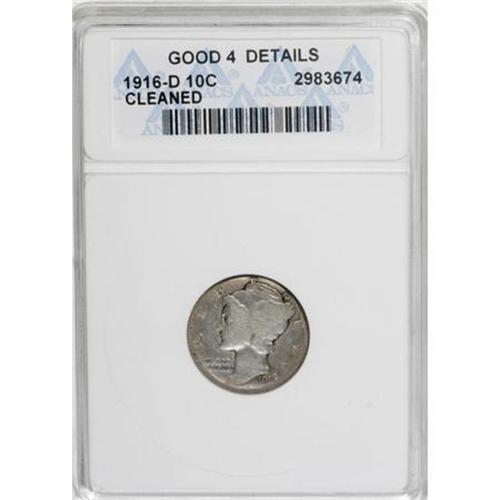 <B>1916-D 10C --Cleaned--ANACS. Good 4 Details.</B></I> The obverse is somewhat bright from a wipe, but the all-important date and mintmark are bold. The tops of the letters in AMERICA are partly merged into the rim.<BR><BR><b>Shipping:</b> Coins & Currency (<a target="_blank" href="http://www.heritageauctions.com/common/shipping.php">view shipping information</a>)