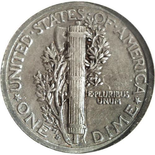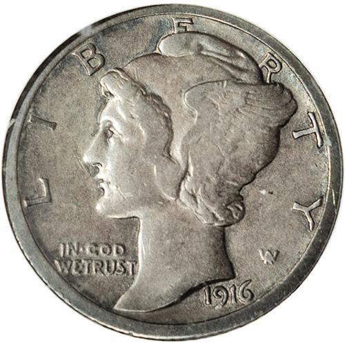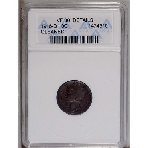 <B>1916-D<10C>--Cleaned--ANACS. VF30 Details.</B></I> This deep slate-gray key date dime is glossy from a moderate cleaning, but is not offensively hairlined. The vertical lines in the fasces are largely separated, and all legends are bold, including the all-important date and mintmark. Middle grade examples of this issue are very scarce.