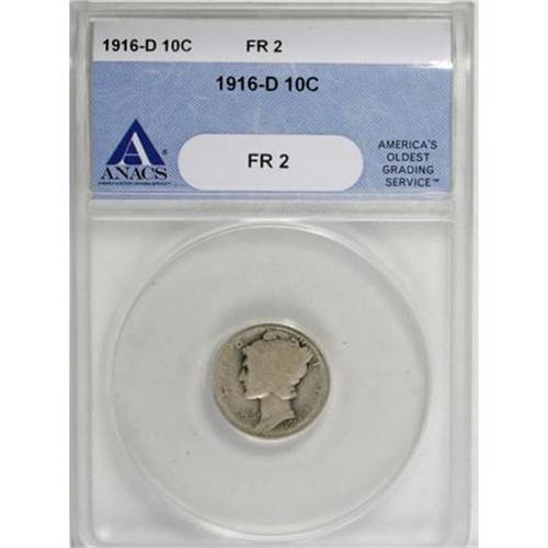 <B>1916-D 10C F2 ANACS.</B></I> NGC Census: (159/1218). PCGS Population (124/2954). Mintage: 264,000. Numismedia Wsl. Price for NGC/PCGS coin in F2 : $281. (#4906)<BR><BR><B>Coin Engraver:</B> Adolph A. Weinman<BR><BR><b>Shipping:</b> Coins & Currency (<a target="_blank" href="http://www.heritageauctions.com/common/shipping.php">view shipping information</a>)
