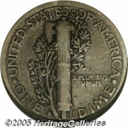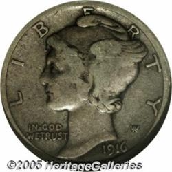 <B>1916-D 10C Fine 12 NGC.</B></I> Evenly worn overall, the surfaces are a medium rose-gray color with hints of charcoal patina in the crevices. A popular collector coin that has not been messed with, the reverse is slightly rotated to the right.