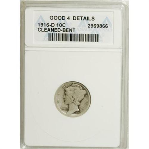 <B>1916-D 10C --Bent, Cleaned--ANACS. Good 4 Details.</B></I> NGC Census: (159/546). PCGS Population (543/1383). Mintage: 264,000. Numismedia Wsl. Price for NGC/PCGS coin in G4 : $775. (#4906)<BR><BR><B>Coin Engraver:</B> Adolph A. Weinman<BR><BR><b>Shipping:</b> Coins & Currency (<a target="_blank" href="http://www.heritageauctions.com/common/shipping.php">view shipping information</a>\)