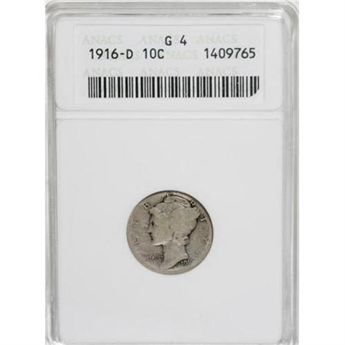<B>1916-D 10C G4 ANACS.</B></I> NGC Census: (163/565). PCGS Population (575/1426). Mintage: 264,000. Numismedia Wsl. Price for NGC/PCGS coin in Good 44 : $800. (#4906)<BR><BR><B>Coin Engraver:</B> Adolph A. Weinman<BR><BR><b>Shipping:</b> Coins & Currency (<a target="_blank" href="http://www.heritageauctions.com/common/shipping.php">view shipping information</a>\)