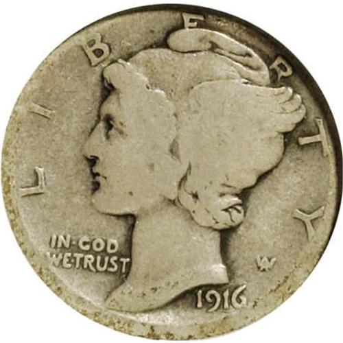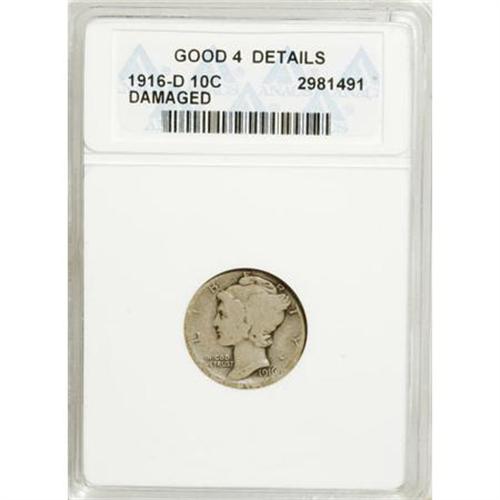<B>1916-D 10C --Damaged--ANACS. Good 4 Details.</B></I> NGC Census: (173/580). PCGS Population (612/1474). Mintage: 264,000. Numismedia Wsl. Price for NGC/PCGS coin in G4 : $800. (#4906)<BR><BR><B>Coin Engraver:</B> Adolph A. Weinman<BR><BR><b>Shipping:</b> Coins & Currency (<a target="_blank" href="http://www.heritageauctions.com/common/shipping.php">view shipping information</a>)