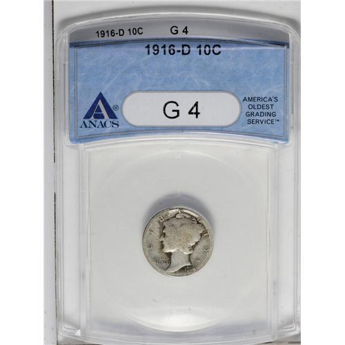 <B>1916-D 10C Good 4 ANACS.</B></I> The obverse rim is complete while there is weakness on the reverse rim due to wear. Popular key date issue, and quite nice for the grade.<BR><BR><b>Shipping:</b> Coin/Currency (<a target="_blank" href="http://www.heritageauctions.com/common/shipping.php">view shipping information</a>)