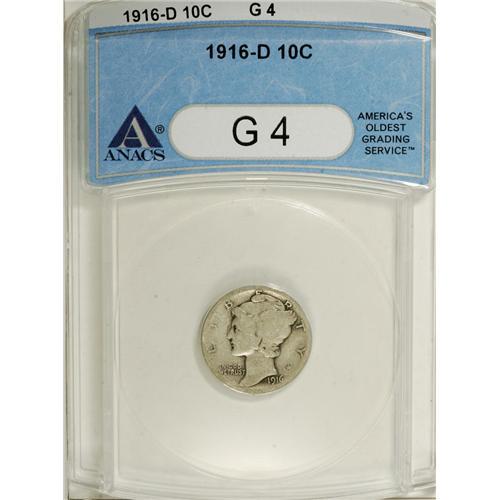 <B>1916-D 10C Good 4 ANACS.</B></I> This is a nicely detailed example for the grade, with honestly worn features and light-gray surfaces that show a few faint marks on each side but no severe abrasions. An affordable example of the unchallenged key to the Mercury dime series at all grade levels.<BR><BR><b>Shipping:</b> Coins & Currency (<a target="_blank" href="http://www.heritageauctions.com/common/shipping.php">view shipping information</a>)