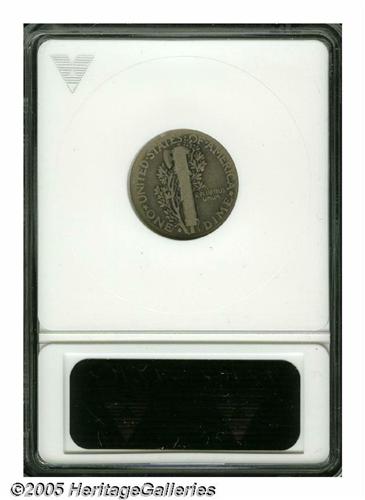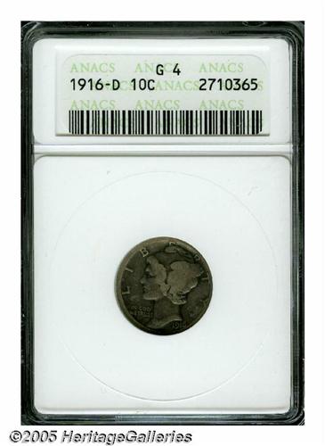 <B>1916-D<10C> Good 4 ANACS.</B></I> This key date shows medium gray-rose toning with accents of pale blue. A few minor contact marks are noted on Mercury's cheek, neck, and cap. Overall, a decent coin for the grade that will fit nicely into a low-grade Mercury set.