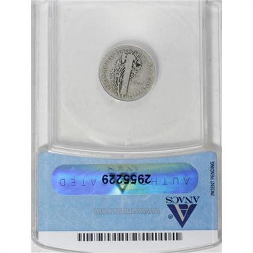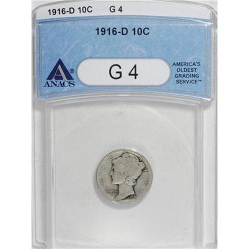 <B>1916-D 10C Good 4 ANACS.</B></I> Light gray surfaces still exhibit a fair amount of detail on this Good 4 '16-D specimen. The obverse rim is virtually full, and has worn only slightly into a couple of letters; the outer portions of about half of the reverse letters have merged with the rim. A couple of inoffensive, small marks are entirely consistent with the grade designation. A great key-date piece for a low-grade Mercury dime set.<BR><BR><b>Shipping:</b> Coins & Currency (<a target="_blank" href="http://www.heritageauctions.com/common/shipping.php">view shipping information</a>)