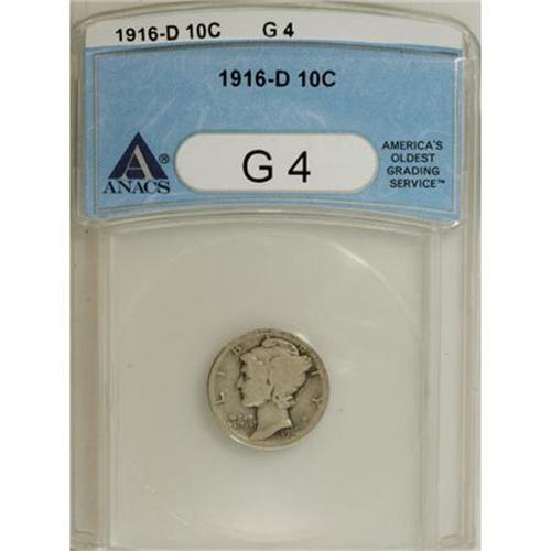 <B>1916-D 10C Good 4 ANACS.</B></I> The date and mintmark are free from the rim, although the tops of AMERICA are partly blended into the border. An ivory-gray example of this coveted collector key.<BR><BR><B>Coin Engraver:</B> Adolph A. Weinman<BR><BR><b>Shipping:</b> Coins & Currency (<a target="_blank" href="http://www.heritageauctions.com/common/shipping.php">view shipping information</a>)
