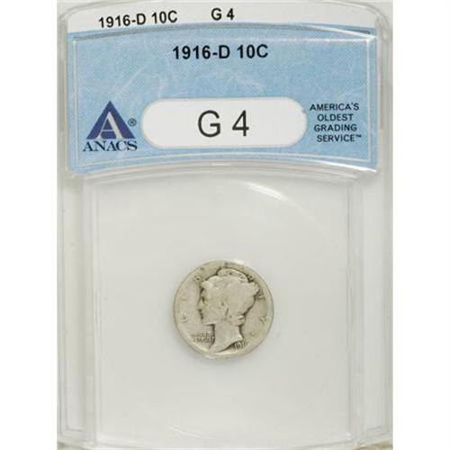 <B>1916-D 10C Good 4 ANACS.</B></I> This slate-gray key date dime has a sharp mintmark and a clear date. Marks are minor, and most peripheral letters are distinct from the rim or nearly so.<BR><BR><B>Coin Engraver:</B> Adolph A. Weinman<BR><BR><b>Shipping:</b> Coins & Currency (<a target="_blank" href="http://www.heritageauctions.com/common/shipping.php">view shipping information</a>)