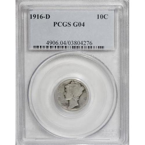 <B>1916-D 10C Good 4 PCGS.</B></I> This is a truly pleasing key-date representative for the grade level. Semi-bright, silver-gray surfaces are remarkably clean for a coin having seen the circulation that this Good example has. The obverse legend, motto, and date are sharp, as are most of the elements on the reverse, where about half of the peripheral letters show slight merging with the rim. Close examination reveals no mentionable marks. This piece is sure to find a home in a low to mid-grade, problem-free Mercury dime collection.<BR><BR><b>Shipping:</b> Coins & Currency (<a target="_blank" href="http://www.heritageauctions.com/common/shipping.php">view shipping information</a>)