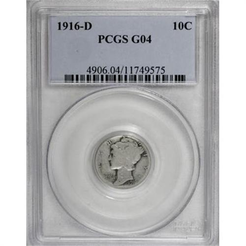 <B>1916-D 10C Good 4 PCGS.</B></I> This is a well worn example of the Mercury dime's key date, with light-gray surfaces that show a few instances of pale reddish-gray color. A couple of faint pinscratches are noted on the obverse. <BR><BR><B>Coin Engraver:</B> Adolph A. Weinman<BR><BR><b>Shipping:</b> Coins & Currency (<a target="_blank" href="http://www.heritageauctions.com/common/shipping.php">view shipping information</a>)