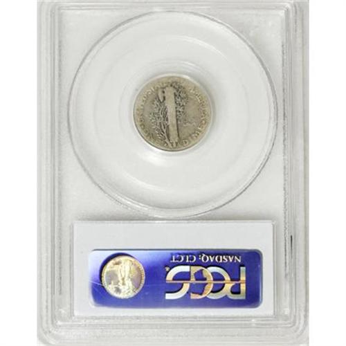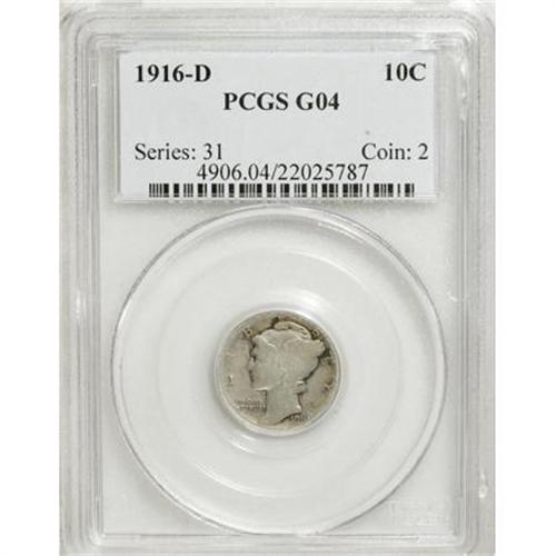 <B>1916-D 10C Good 4 PCGS.</B></I> The obverse is bolder than one would expect on a piece in this grade while the reverse is more typical. Some light hairline scratches curve up the center of the obverse. The steel color is uniform and the surfaces are rather glossy.<BR><BR><B>Coin Engraver:</B> Adolph A. Weinman<BR><BR><b>Shipping:</b> Coins & Currency (<a target="_blank" href="http://www.heritageauctions.com/common/shipping.php">view shipping information</a>)