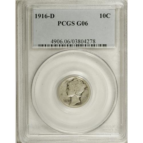 <B>1916-D 10C Good 6 PCGS.</B></I> The smooth surfaces are abrasion-free, and even wear leaves plenty of design detail evident for the grade. One of the most famous 20th century key dates, along with the 1909-S VDB Lincoln cent.<BR><BR><b>Shipping:</b> Coins & Currency (<a target="_blank" href="http://www.heritageauctions.com/common/shipping.php">view shipping information</a>)