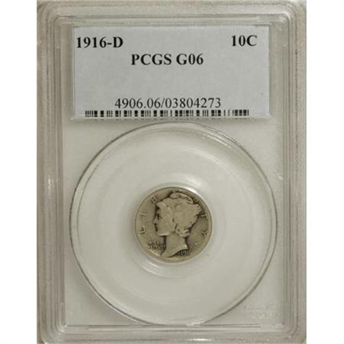 <B>1916-D 10C Good 6 PCGS.</B></I> The 1916-D dimes were produced from four different reverse dies, but each one is characterized by a mintmark with a triangle-shaped opening and well-defined serifs. All of the date digits are separated from the rim on this piece, but a couple of the letters each in LIBERTY and AMERICA merge into it. Nice silver-gray color.<BR><BR><B>Coin Engraver:</B> Adolph A. Weinman<BR><BR><b>Shipping:</b> Coins & Currency (<a target="_blank" href="http://www.heritageauctions.com/common/shipping.php">view shipping information</a>\)