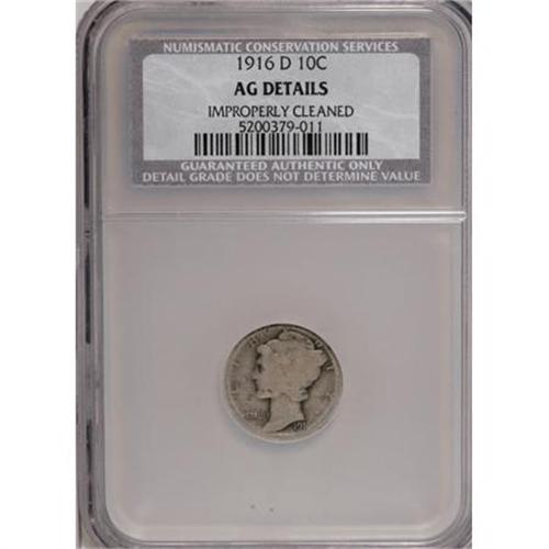 <B>1916-D 10C --Improperly Cleaned--NCS. AG Details.</B></I> The mintmark is filled but boldly outlined. The date is also sharp, although the base of the 6 touches the rim. The reverse peripheral legend is 50% worn into the rim. The lower half of the obverse is hairlined.<BR><BR><B>Coin Engraver:</B> Adolph A. Weinman<BR><BR><b>Shipping:</b> Coins & Currency (<a target="_blank" href="http://www.heritageauctions.com/common/shipping.php">view shipping information</a>)