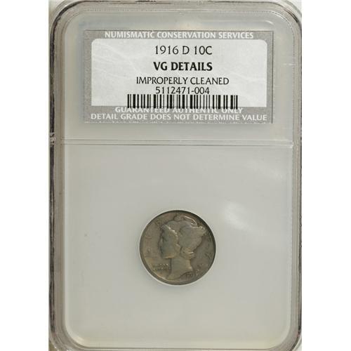 <B>1916-D 10C --Improperly Cleaned--NCS. VG Details.</B></I> This key date dime has bold legends and partial definition of the vertical fasces lines. Rich lime and lilac toning embraces the slightly bright surfaces.<BR><BR><b>Shipping:</b> Coins & Currency (<a target="_blank" href="http://www.heritageauctions.com/common/shipping.php">view shipping information</a>)