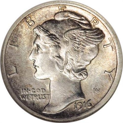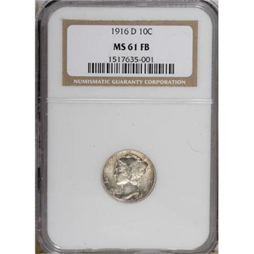 <B>1916-D 10C MS61 Full Bands NGC.</B></I> Like the 1909-S VDB cent, the 1916-D dime is more available in Mint State grades than some other key issues, largely due to its first-year status. Members of the general public saved examples, and so the issue has a significant proportion of higher-grade survivors. At the same time, those coins held by non-numismatists often suffered from careless handling, which helps explain the lack of Gem and better representatives.<BR> Lange (2005) describes the 1916-D issue as "nearly always well struck, with many Mint State examples qualifying" for the Full Bands designation. On this piece, the bands of the fasces exhibit full separation and rounding as well. The surfaces offer pleasing luster and a blend of gunmetal and gold color at the margins, while the centers retain a silver-gray appearance. Wispy abrasions in the textured fields and on the devices account for the grade, though the coin would rate considerably better on visual appeal alone.<BR><BR><b>Shipping:</b> Coins & Currency (<a target="_blank" href="http://www.heritageauctions.com/common/shipping.php">view shipping information</a>)