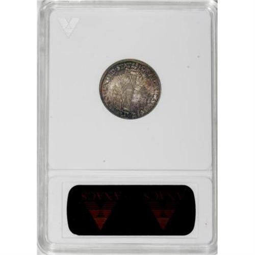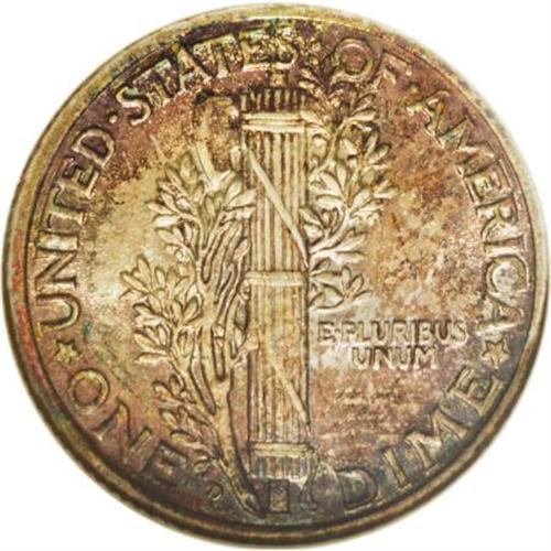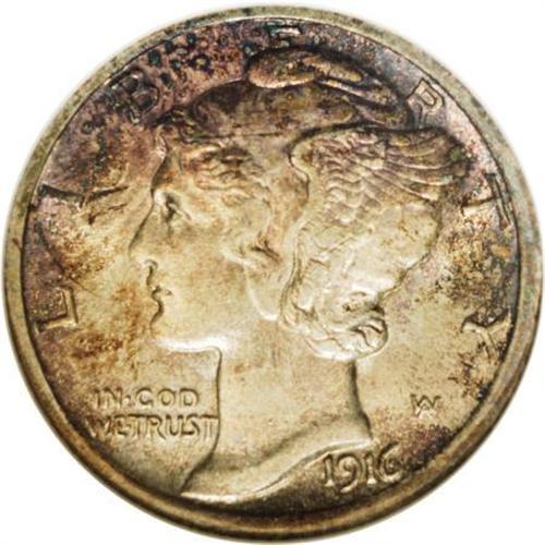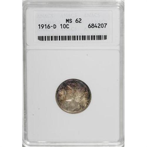 <B>1916-D 10C MS62 ANACS.</B></I> Lustrous and boldly struck, with minor weakness on the fasces and the central reverse bands. This is still an important and conditionally scarce representative of the unquestioned key date in the Mercury dime series. Deep purple, rose, golden-brown and cobalt-blue patina adorns the reverse and the upper half of the obverse. Just one or two tiny contact marks are revealed on each side, under careful inspection. <BR><BR><B>Coin Engraver:</B> Adolph A. Weinman<BR><BR><b>Shipping:</b> Coins & Currency (<a target="_blank" href="http://www.heritageauctions.com/common/shipping.php">view shipping information</a>)