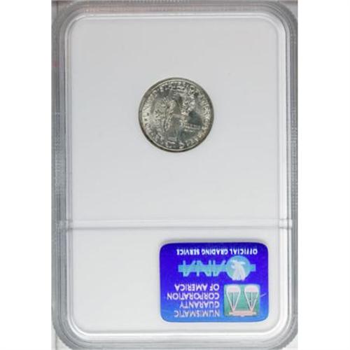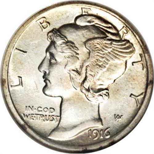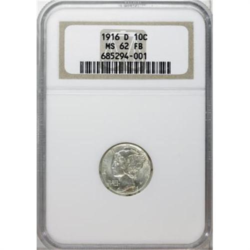 <B>1916-D 10C MS62 Full Bands NGC.</B></I> The 1916-D dime is a "coin board classic," one of the early 20th century issues that reaped tremendous publicity from the mass-produced cardboard coin folders widely distributed in the 1930s and later. Even in those early days, the 1916-D was the most popular and costliest Mercury dime by far; Lange's <I>Complete Guide to Mercury Dimes</B></I> quotes a January 1940 advertisement placed in <I>The Numismatist</B></I> that offered Uncirculated 1916-D pieces for $9.50, compared to just $0.85 for the 1916 and $0.60 for the 1916-S.<BR> Though prices have escalated since that distant day, collectors seek examples of this coveted issue no less fervently. This gold-accented piece, silver-white otherwise with lustrous and mildly textured fields, shows strong central detail that included full separation on the bands. Wispy abrasions on the portrait preclude a finer designation, yet the eye appeal remains strong.<BR><BR><B>Coin Engraver:</B> Adolph A. Weinman<BR><BR><b>Shipping:</b> Coins & Currency (<a target="_blank" href="http://www.heritageauctions.com/common/shipping.php">view shipping information</a>)