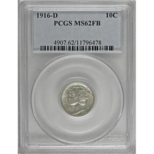 <B>1916-D 10C MS62 Full Bands PCGS.</B></I> Wispy gold toning on the obverse does little to diminish the brilliant silver surfaces of this frosty Mint State piece. The design elements are sharp, except for the highpoints of the obverse that are slightly blunt. All reverse details, including the central bands, are crisp.<BR> The 1916-D Mercury dime is coveted as a key date issue in all grades. This piece, near the lower end of the Mint State scale, provides an excellent opportunity for the specialist to acquire an attractive coin at a price level more reasonable than other higher grade coins.<BR><BR><B>Coin Engraver:</B> Adolph A. Weinman<BR><BR><b>Shipping:</b> Coins & Currency (<a target="_blank" href="http://www.heritageauctions.com/common/shipping.php">view shipping information</a>)