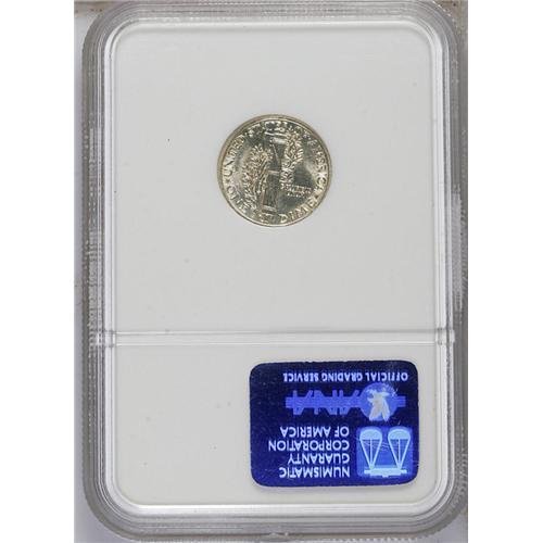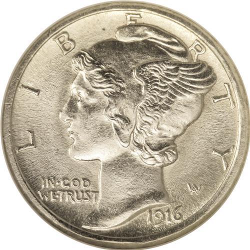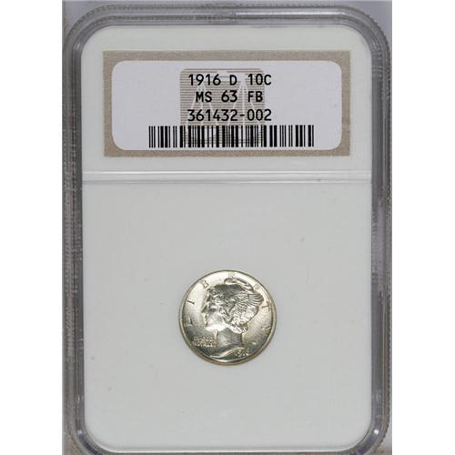 <B>1916-D<10C> MS63 Full Bands NGC.</B></I> The key date to the Mercury dime series, the 1916-D dime is an issue that is in demand in AG or Mint State--and everything in between, as long as the mintmark is visible and the authenticity is certain. Recent price surges for this issue obviously reflect that ceaseless demand, and show no sign of diminution. Mint State examples are certainly difficult to locate, which is why we are pleased to offer no less than four different examples in the present sale. This specimen has a well executed strike and satiny silver luster, with brilliant surfaces complemented by a hint of champagne toning. The all-important central bands are fully split (as are the top and bottom horizontal bands), although the lower diagonal joins the nearby olive leaf, as often seen. A couple of ticks on each band likely help determine the grade, but this piece seems high-end, and there is no doubt at all about its eye appeal. Census: 21 in 63, 86 finer (7/06).
