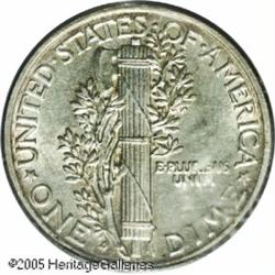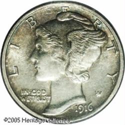 <B>1916-D 10C MS63 PCGS.</B></I> Lightly toned with subdued, satiny luster typical of all issues from this time frame. The obverse is typically sharp, while the fasces on the reverse show a contact mark the prohibits a Full Bands designation. An important 20th century rarity and a particularly desirable item in Uncirculated grades. Lot:6334