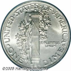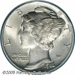 <B>1916-D 10C MS63 PCGS.</B></I> Typical satiny luster with a fully brilliant, untoned appearance over each side. Unfortunately, the strike wanes a bit on the central cross bands on the reverse, somewhat limiting it in grade. Still, a very Select, virtually mark-free example of one of the most coveted of all 20th century silver issues and the key to the Mercury Dime series.
